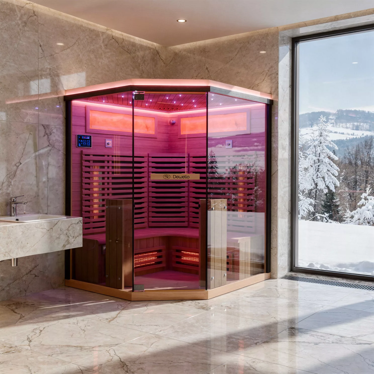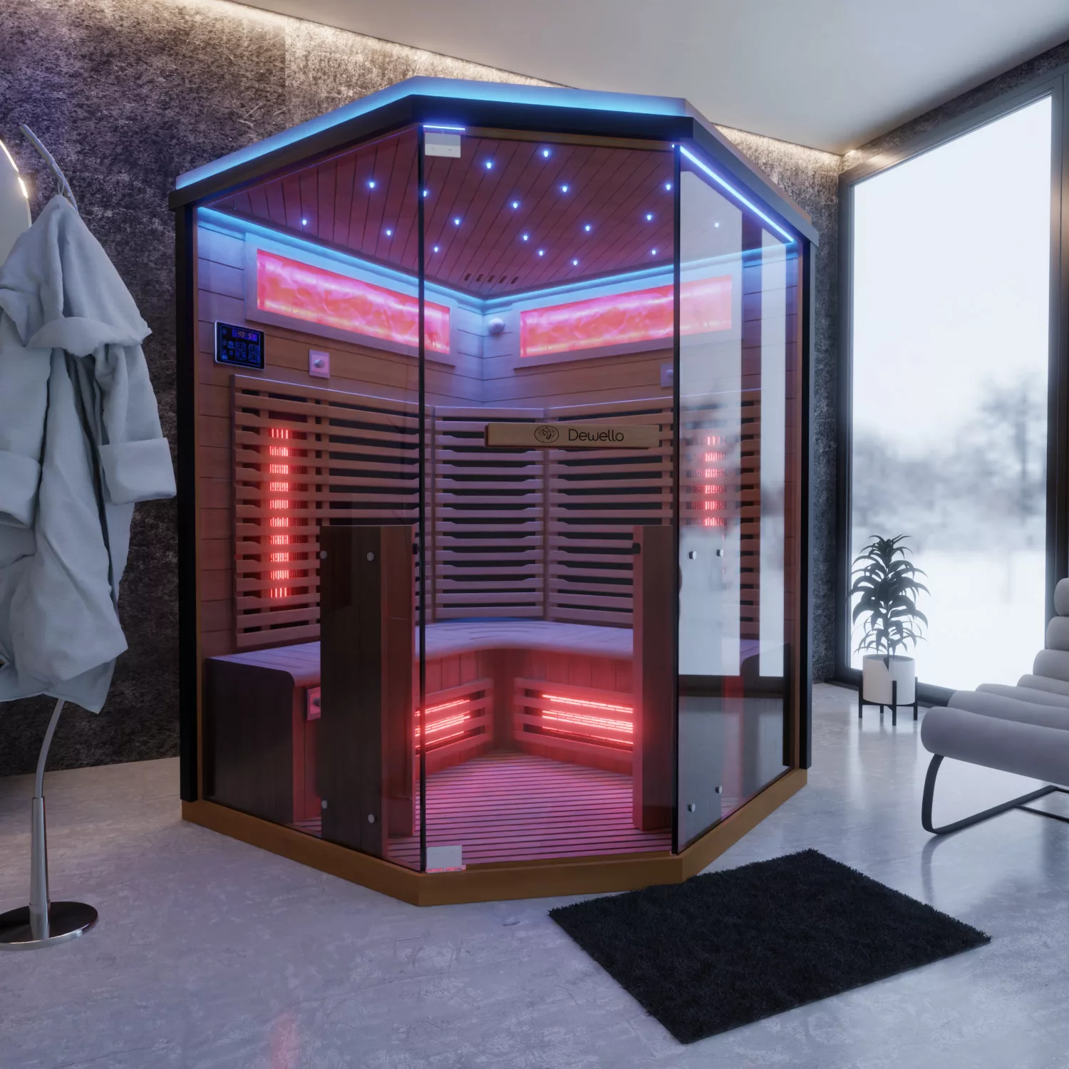 Optisch wirkt die Kabine hochwertig durch ESG-Sicherheitsglas in brauner Glasfarbe. Tür und Seitenelemente sind jeweils 8 mm stark. Für Atmosphäre sorgt die Beleuchtung mit Sternenhimmel, LED-Band und beleuchtetem Salzsteinelement. Zusätzlich gibt es ein LED-Band außen, das die Kabine dezent in Szene setzt.