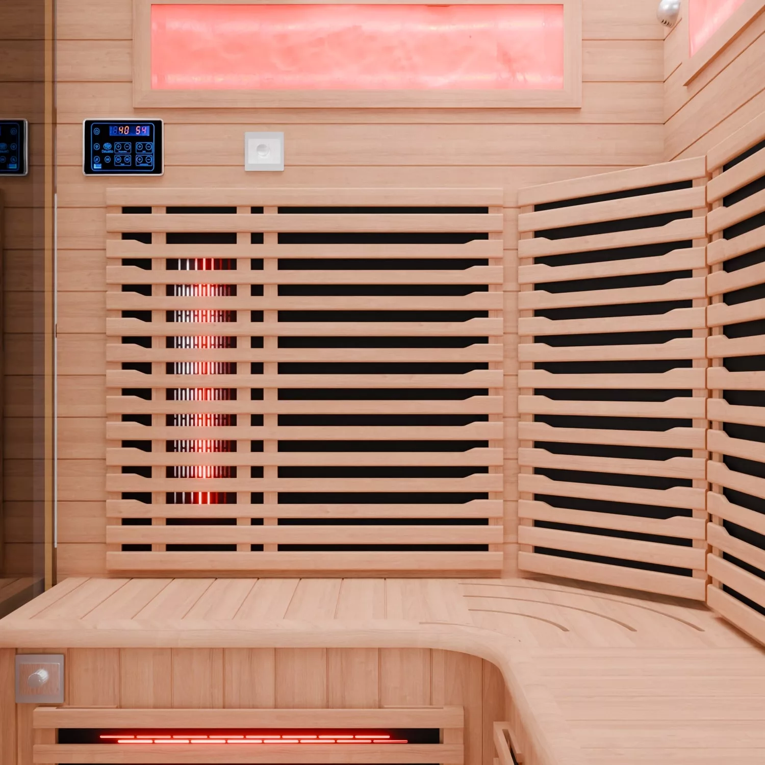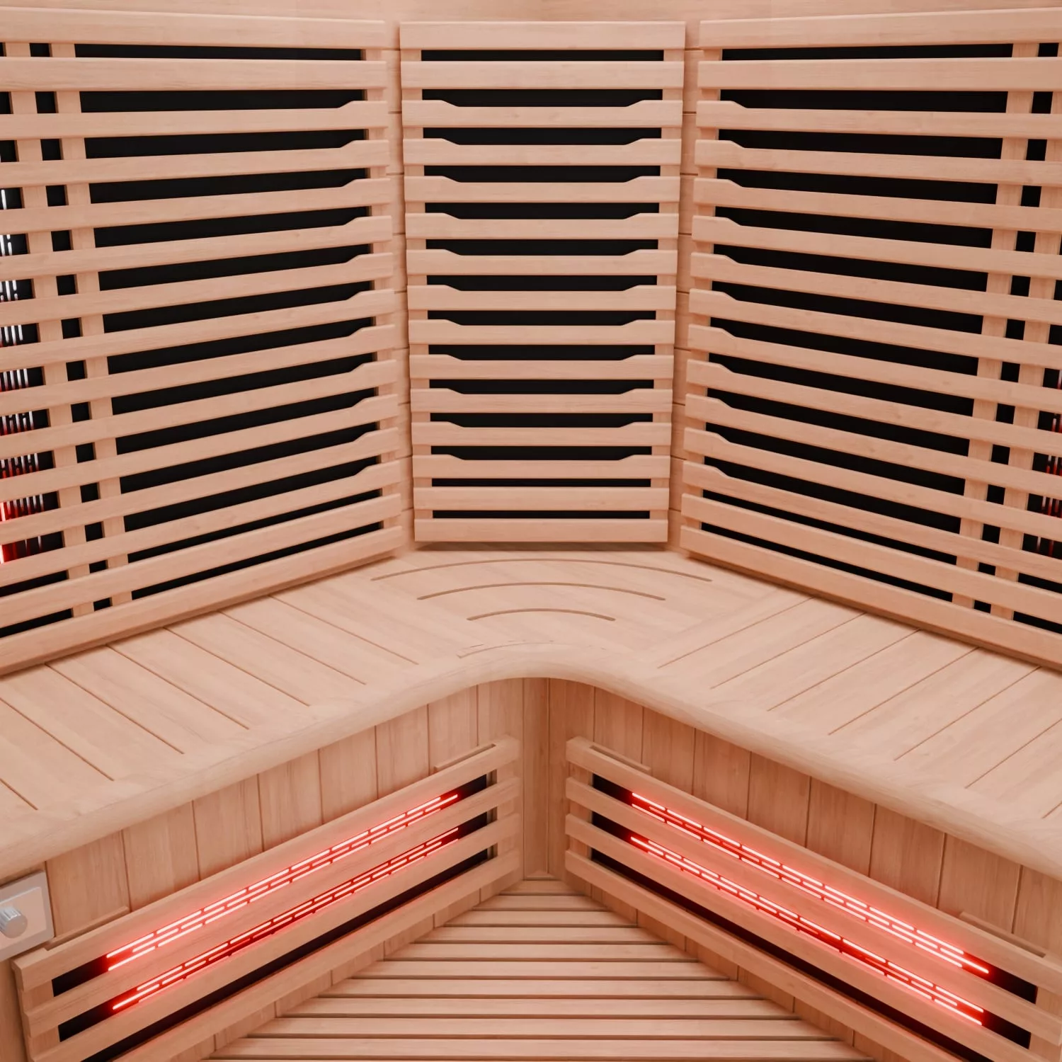 Die Wärme ist so verteilt, dass die typischen Zonen direkt erreicht werden: Vollspektrum arbeitet gezielt an Rücken, Waden, Front und zusätzlich in der Ecke. Die Karbonflächen liefern eine gleichmäßige, angenehme Grundwärme – besonders im Bereich Rücken/Boden. Praktisch: Die Vollspektrumleistung lässt sich stufenlos per Drehknopf regulieren. Die Frontstrahler sind drehbar. So kann man während des Saunagangs die Stärke der Vollspektrumstrahler nachjustieren, als auch die Strahlung zur Person hin- oder wegdrehen, ohne feste Temperaturstufen oder Strahler.