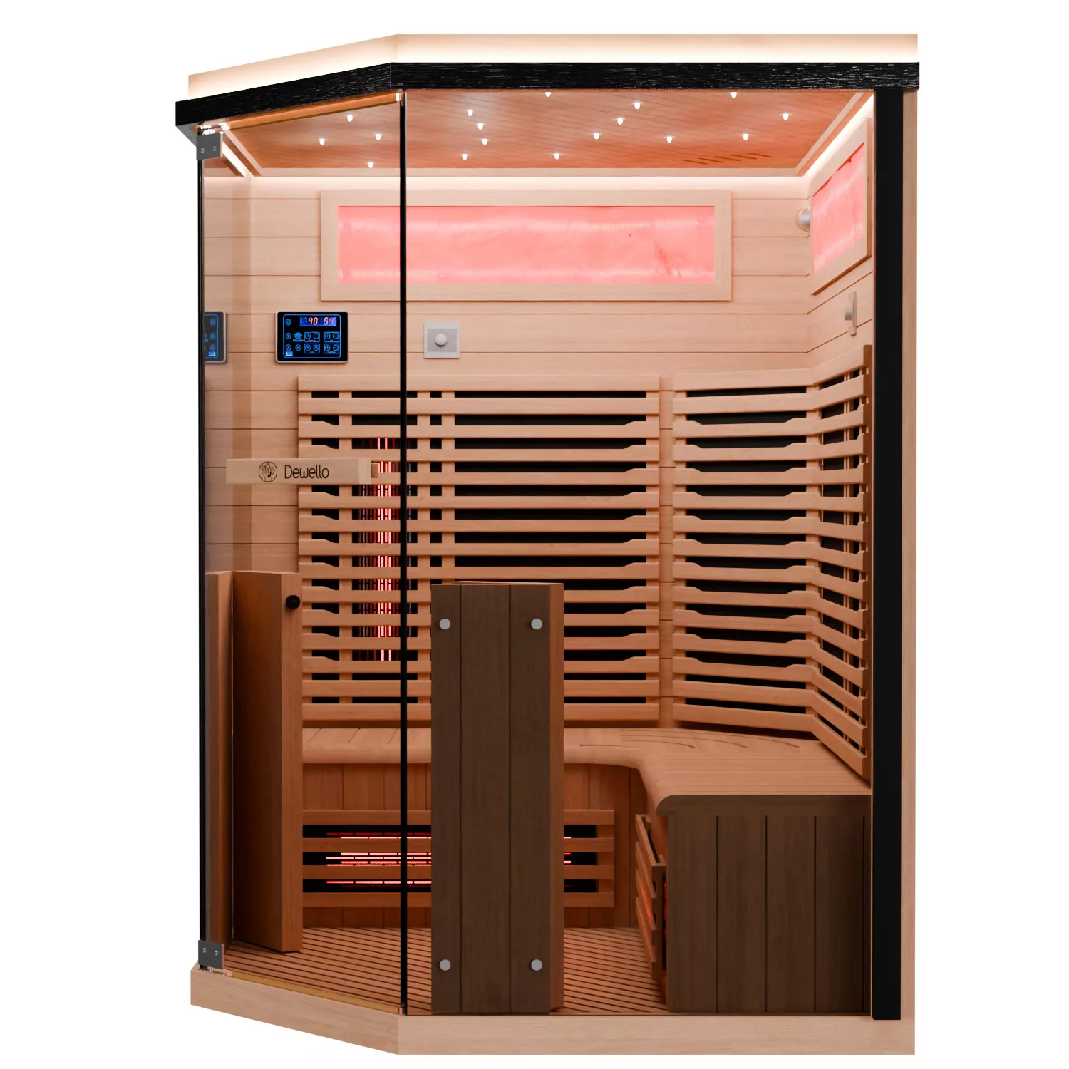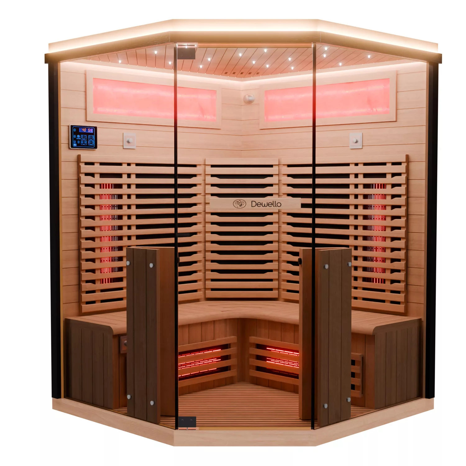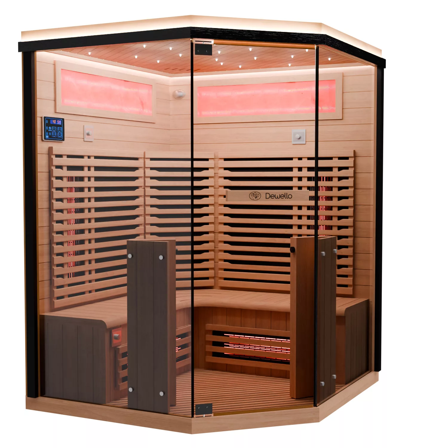 Dewello Infrarotkabine KENORA 140 ist eine großzügige Eckkabine für ca. 1–3 Personen aus Hemlock (ca. 140 x 140 x 190 cm). Durch die Eckform kann man bequem sitzen, sogar direkt in der Ecke – ideal, wenn man beim Saunieren mehr Platz im Schulterbereich möchte.