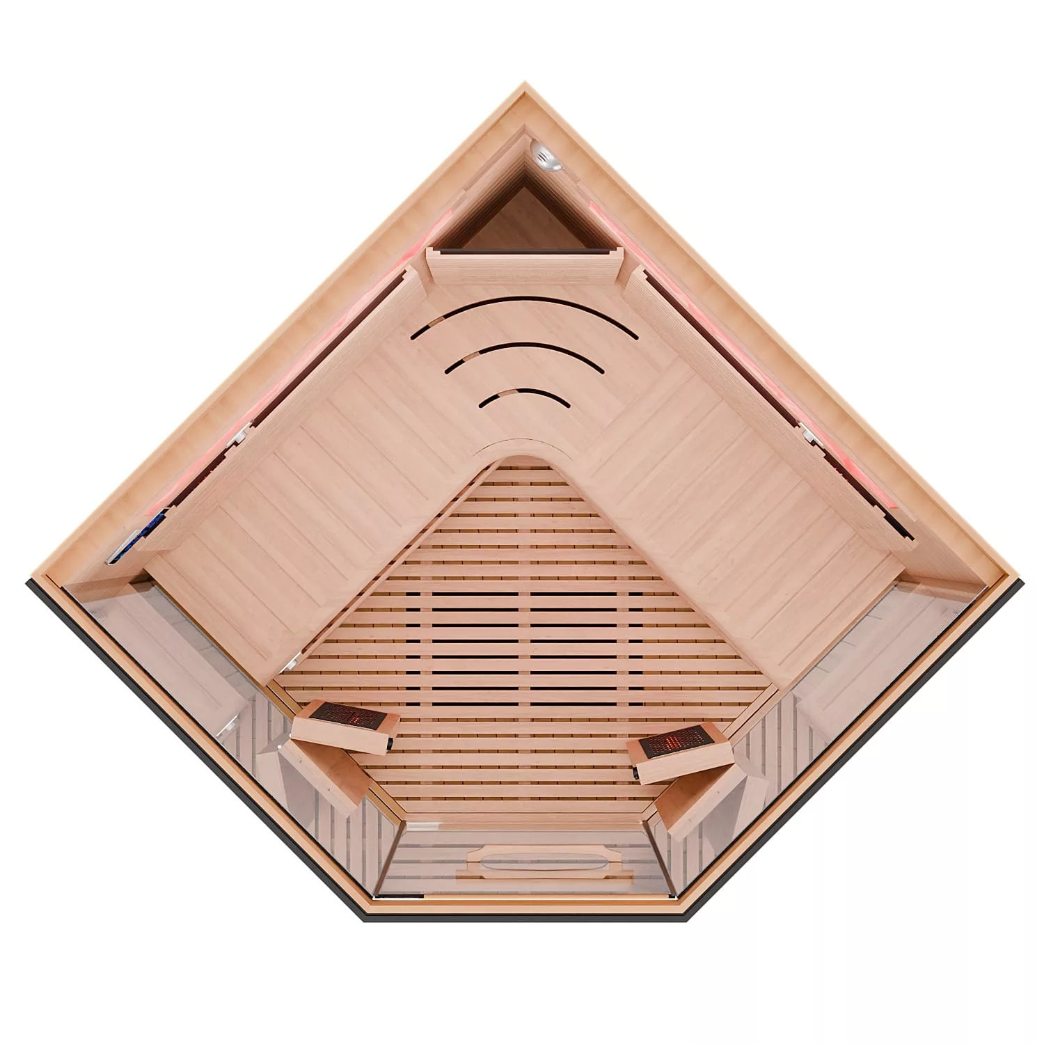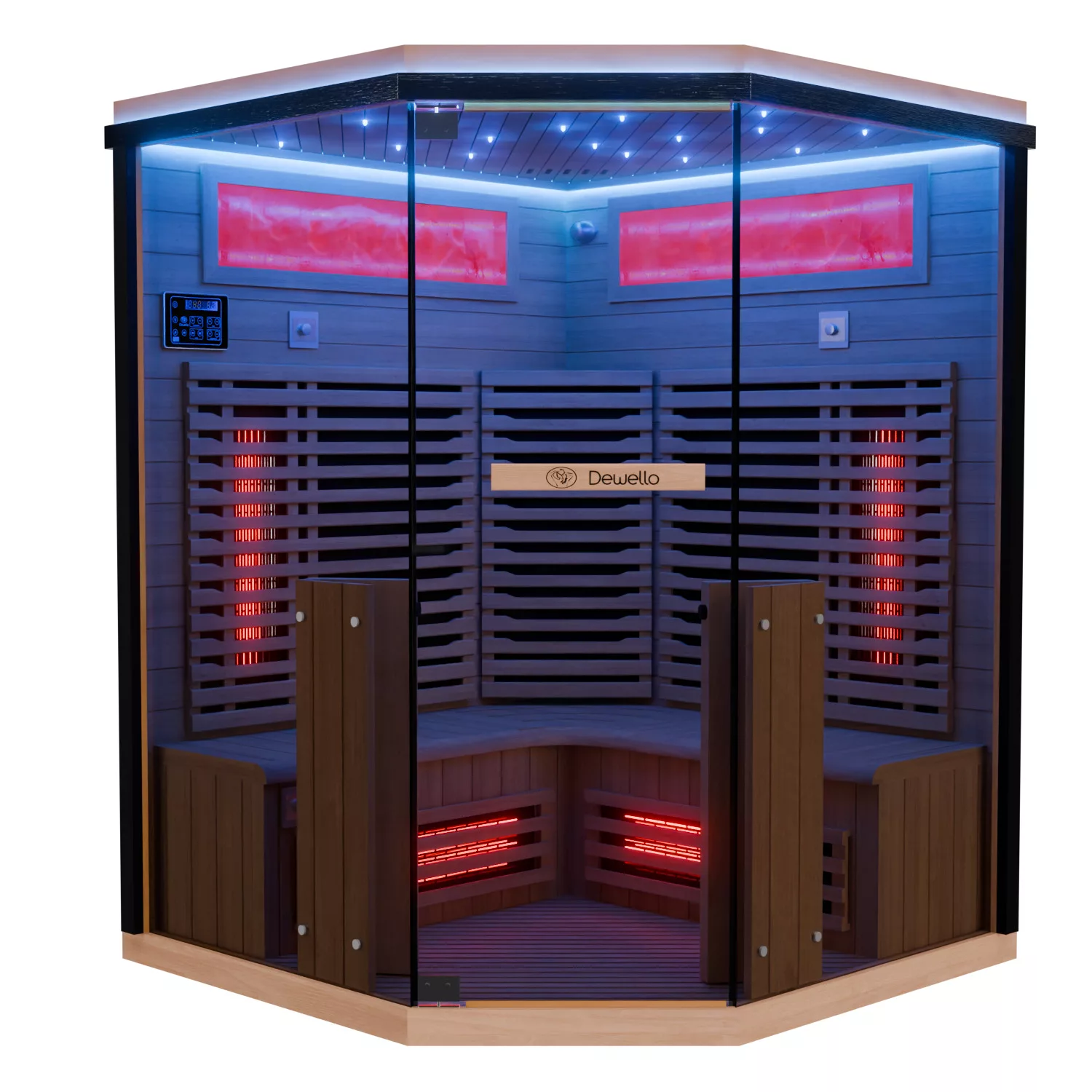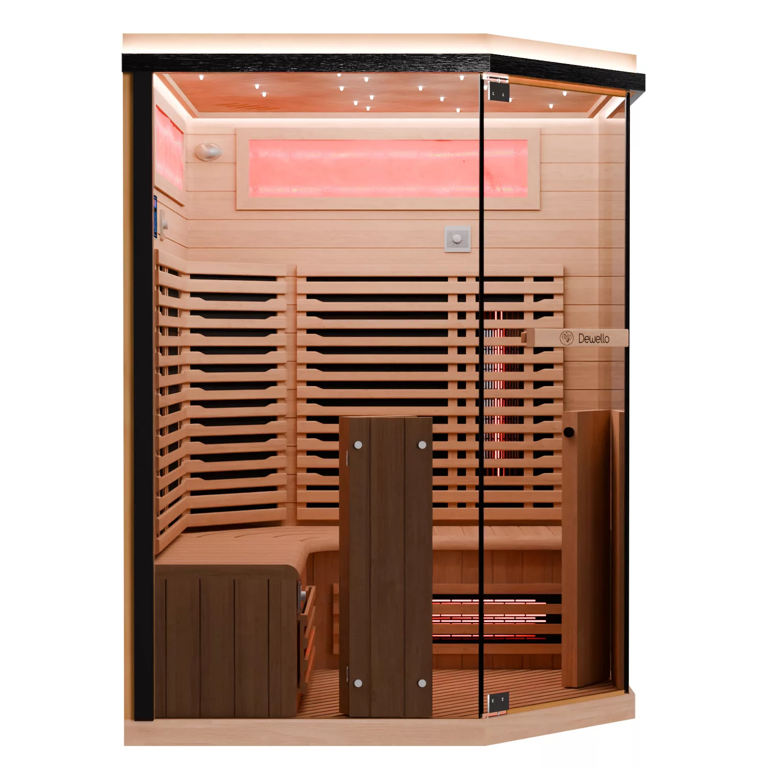 Dewello Infrarotkabine KENORA 140 ist eine großzügige Eckkabine für ca. 1–3 Personen aus Hemlock (ca. 140 x 140 x 190 cm). Durch die Eckform kann man bequem sitzen, sogar direkt in der Ecke – ideal, wenn man beim Saunieren mehr Platz im Schulterbereich möchte.